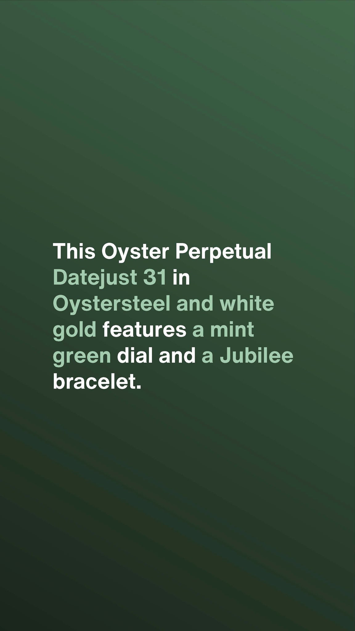 THIS OYSTER PERPETUAL DATEJUST 31 IN OYSTERSTEEL AND WHITE GOLD FEATURES A MINT GREEN DIAL AND A JUBILEE BRACELET.
