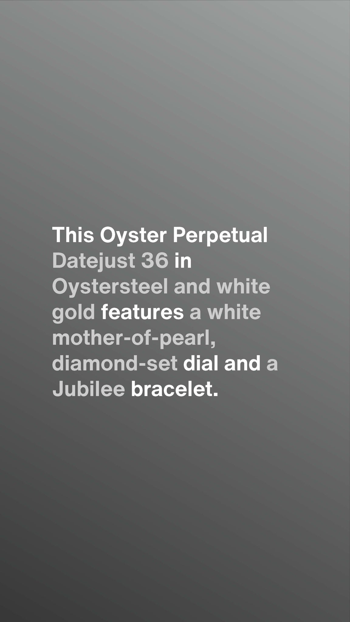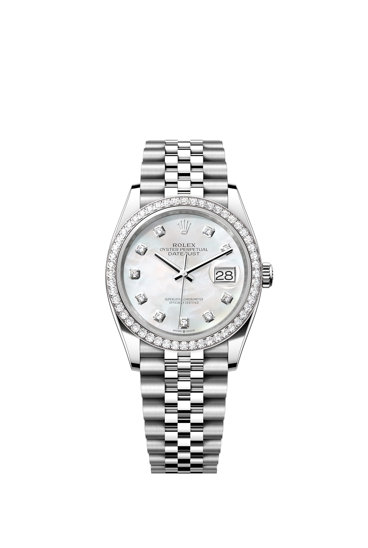 THIS OYSTER PERPETUAL DATEJUST 36 IN OYSTERSTEEL AND WHITE GOLD FEATURES A WHITE MOTHER-OF-PEARL, DIAMOND-SET DIAL AND A JUBILEE BRACELET.