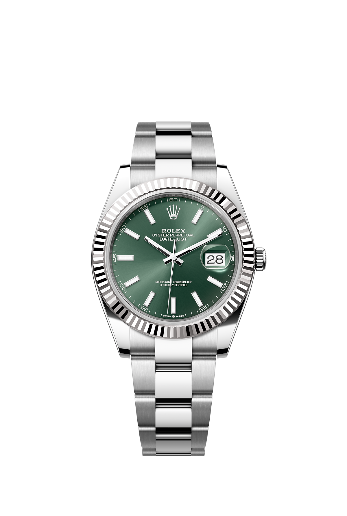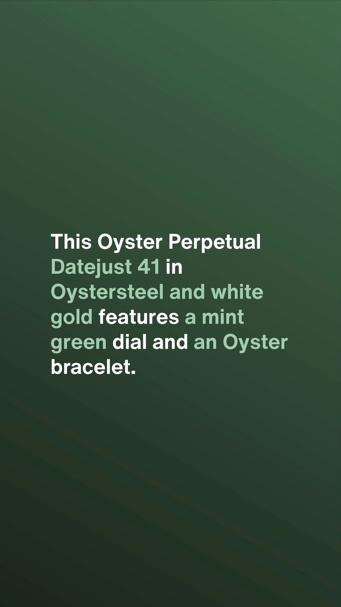 THIS OYSTER PERPETUAL DATEJUST 41 IN OYSTERSTEEL AND WHITE GOLD FEATURES A MINT GREEN DIAL AND AN OYSTER BRACELET.